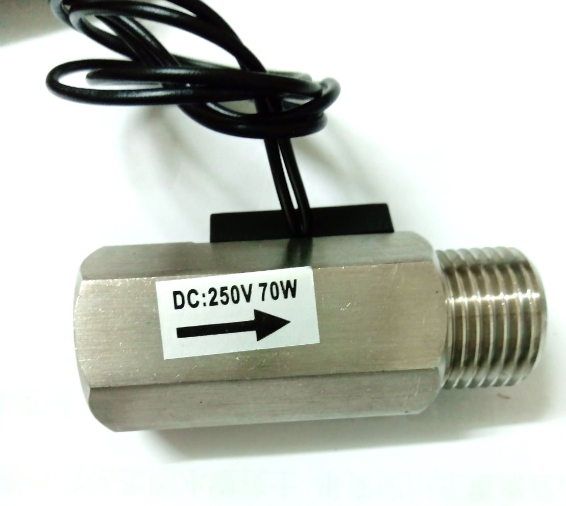 4分管內外牙不銹鋼 水流開關,此款是不銹鋼材質,進水口及出水口有分內牙及外牙及內外牙,本體上有標示箭頭方向,水有通過時,會呈現導通的狀態,額定的電壓及功率為100V 10W 所以可承受的電流只有0.1A,使用時必須透過電磁開關或是繼電器,才能控制負載,可用於電熱水器等相關產品