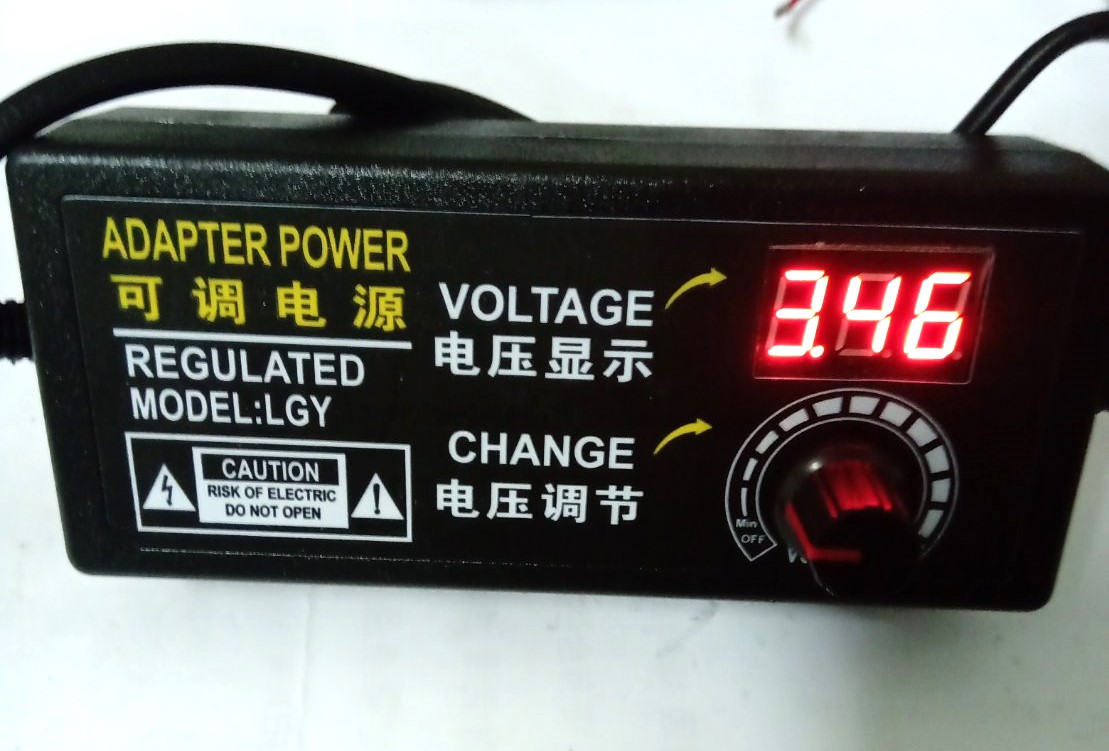 AC110~220V轉DC3~24V 2A可調式變壓器,此產品輸入電壓可以接AC110~220V,輸出部分有提供一個旋鈕,可以調整DC3~24V輸出,並且將電壓值顯示在畫面上,接點為2A,最大可以承受48W的負載,可用於DC3~24V 48W的電子產品做測試使用.
